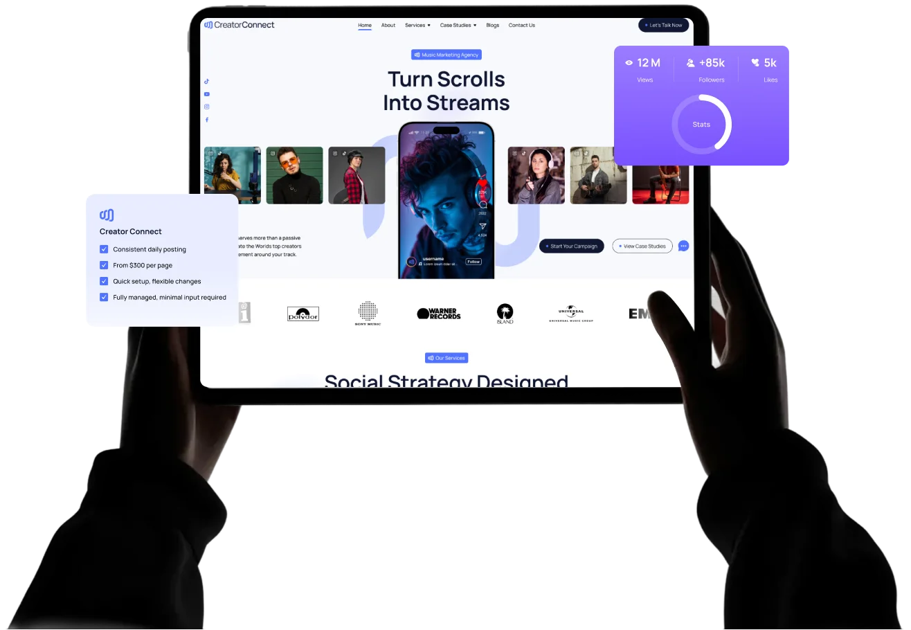 We built a bold, conversion-led website experience for Creator Connect that strengthens credibility and guides artists and partners toward faster action.